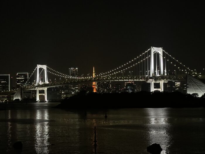 帰りにお台場にもよってレインボーブリッジと東京タワーのコラボレーションも見ることができました。夜の首都高はスピードを出している車が多かったり、カーブも多く、身一つのバイクはだいぶ怖いですが、安全運転で行き来しました。