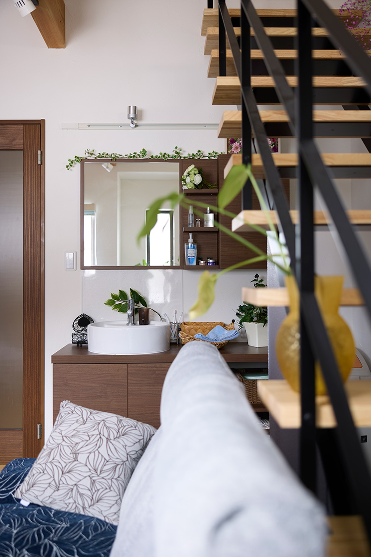 洗面室を確保するとリビング空間が小さくなる。そのデメリットの解消のために提案したアイデアが、小屋裏収納をつくるためにしつらえた階段とその下の空間を活かしたオープン洗面。ご夫婦ふたりだけが使うというライフスタイルを想定し提案しましたが、わんちゃんがいる暮らしだからより活用のシーンが広がりました。