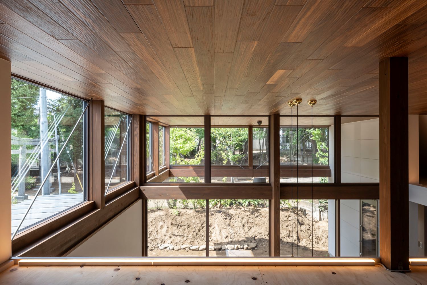 本来柱があるべき場所に柱がないこの建物は、構造計算によって成立しています。構造は木軸以外に鋼材で引っ張って支えています。